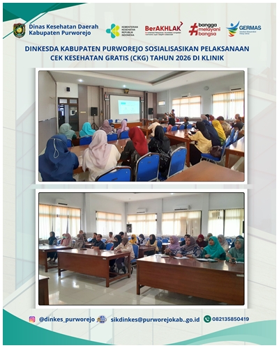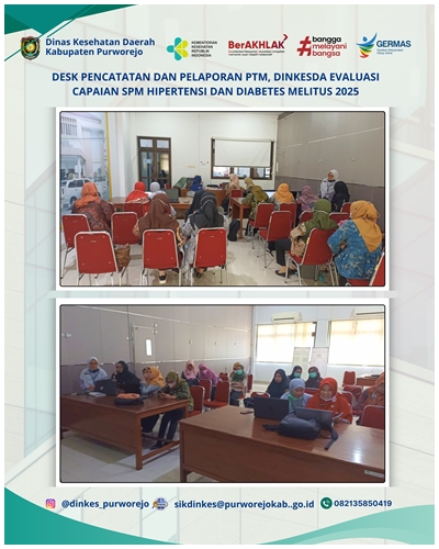 Purworejo, Dinas Kesehatan Daerah Kabupaten Purworejo melaksanakan Pertemuan Desk Data Kesehatan Jiwa, Disabilitas, dan Kekerasan Terhadap Perempuan dan Anak (KTPA) Tahun 2025 pada Kamis, 8 Januari 2026, bertempat di Aula 2B Dinas Kesehatan Daerah Kabupaten Purworejo. Kegiatan diikuti oleh Puskesmas sesuai dengan jadwal yang telah ditetapkan. Pertemuan ini bertujuan untuk melakukan pengisian, pengecekan, dan sinkronisasi data layanan kesehatan jiwa, disabilitas, dan KTPA yang dilaporkan oleh Puskesmas kepada Dinas Kesehatan. Pada pelaksanaan hari ini, sebanyak delapan Puskesmas hadir dan melakukan desk data bersama tim Dinas Kesehatan Daerah Kabupaten Purworejo. Sinkronisasi dilakukan melalui klarifikasi langsung antara data yang dimiliki Puskesmas dengan data yang dihimpun di tingkat kabupaten.
