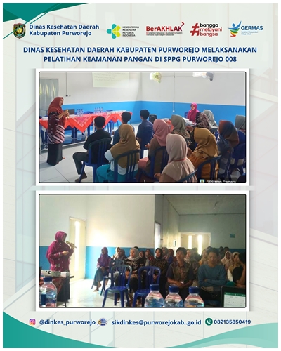 Dinas Kesehatan Daerah Kabupaten Purworejo memberikan materi edukasi kesehatan dan keamanan pangan dalam kegiatan pelatihan yang diselenggarakan oleh SPPG Tersidilor, Kecamatan Pituruh, pada Kamis, 8 Januari 2026, bertempat di Dapur SPPG Tersidi lor. Dalam pelatihan tersebut, narasumber dari Dinas Kesehatan menyampaikan materi terkait penyakit yang dapat ditimbulkan akibat pengolahan makanan yang tidak bersih dan tidak memenuhi standar higiene sanitasi. Beberapa penyakit yang disoroti antara lain diare, keracunan makanan, tifoid, cacingan, serta infeksi saluran pencernaan yang berisiko tinggi pada balita, ibu hamil, dan kelompok rentan lainnya termasuk anak sekolah.